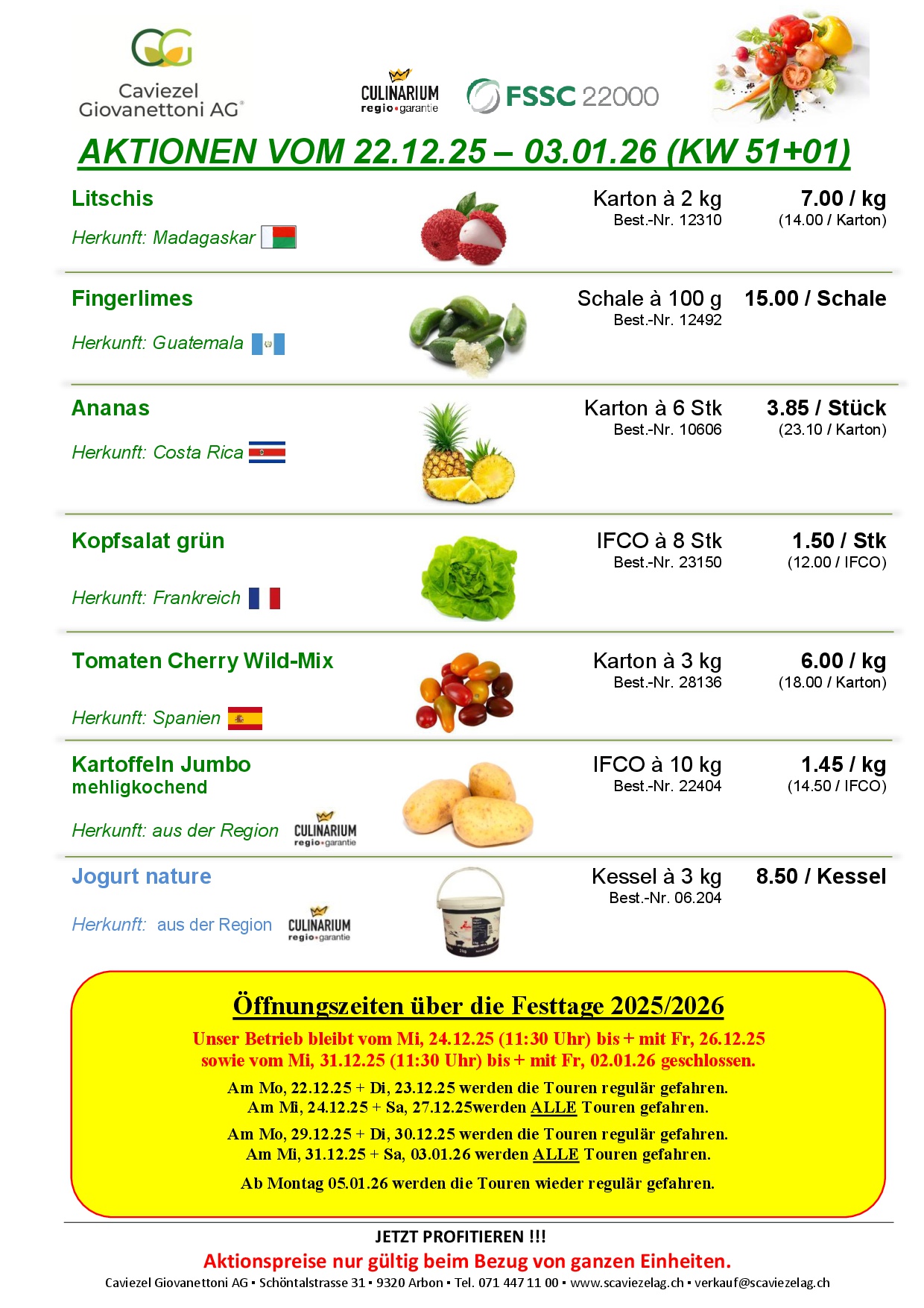 - Öffnungszeiten + Bestell-/Auslieferzeiten über die Festtage